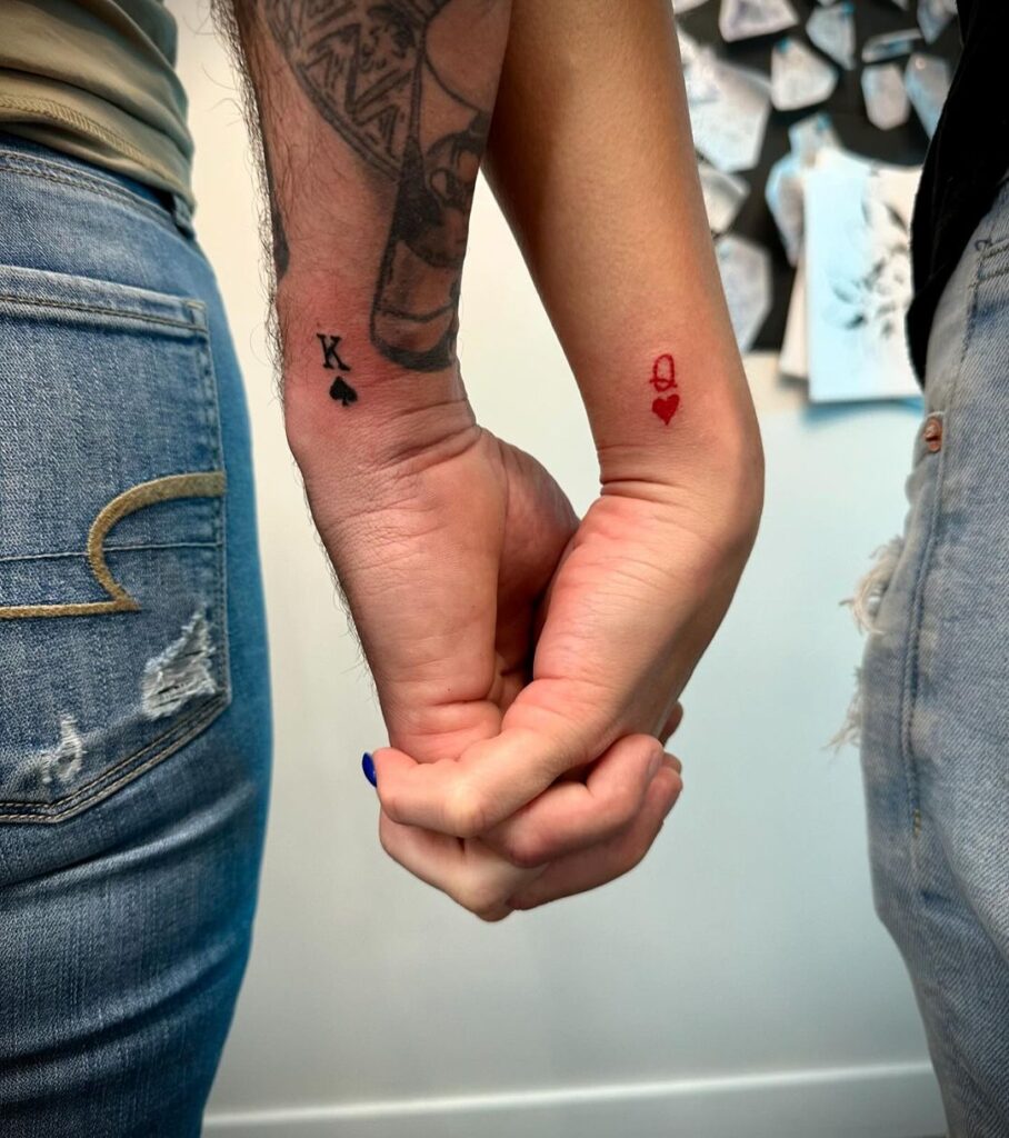 In this couple’s tattoo, the man on the left has a “K” with a spade symbol (♠), representing the King of Spades, while the woman on the right has a small red queen figure with a heart symbol (♥), representing the Queen of Hearts.
