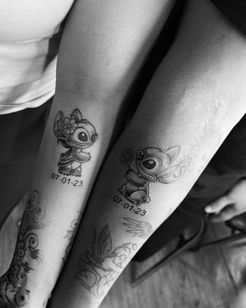 This tattoo features charming cartoon characters inspired by Stitch and Angel from Disney’s “Lilo & Stitch.” Each character is depicted holding a flower, with an additional flower adorning their heads. The tattoos also include the date which marks a significant milestone or anniversary in their relationship.