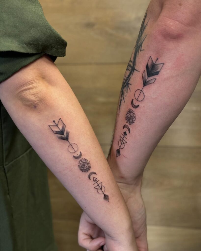 These intricate matching tattoos feature an arrow intertwined with celestial symbols, including crescent moons, a fingerprint, and geometric shapes. The arrow symbolizes direction and purpose, representing a shared journey, while the celestial phases reflect the passage of time and the cycles of life. The fingerprint adds a unique touch, signifying individuality within the partnership.