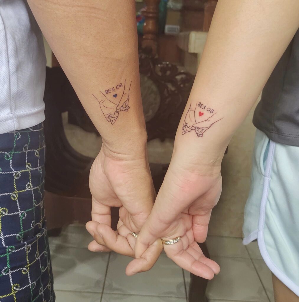 These tattoos depict two hands making a pinky promise, with the inscription “BES 08” and small hearts in red and blue. The pinky promise symbolizes trust, loyalty, and an unbreakable bond, while the inscription likely represents a meaningful date or nickname shared by the couple.