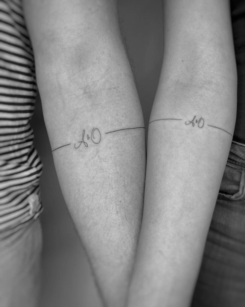 This elegant couple’s tattoo features a thin line wrapping around the arm, intersecting at each partner’s initials, “A & O.” The initials personalize the design, symbolizing a unique bond and the union of their identities.
