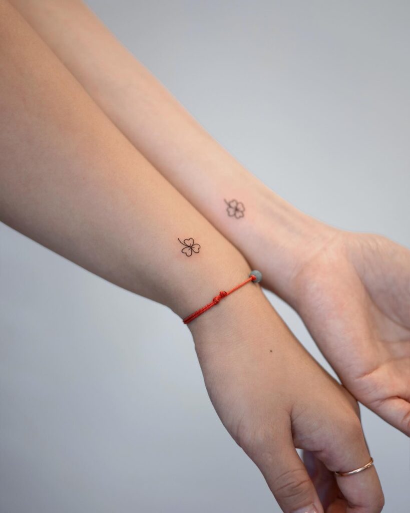 These minimalist matching tattoos feature tiny clover designs, symbolizing luck, positivity, and togetherness. Clovers are often seen as symbols of good fortune, making these tattoos a charming way for a couple to wish each other luck and happiness.