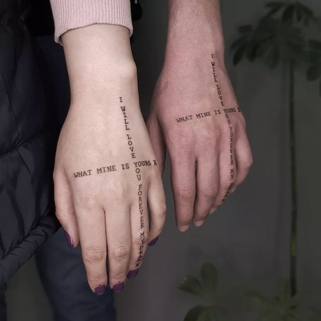 These matching hand tattoos feature text arranged in a cross shape, with the words “I will love you forever my dear” and “What mine is yours,” symbolizing an eternal promise of love and unity. The intersecting lines of text create a cross, representing the strength and commitment in their relationship.