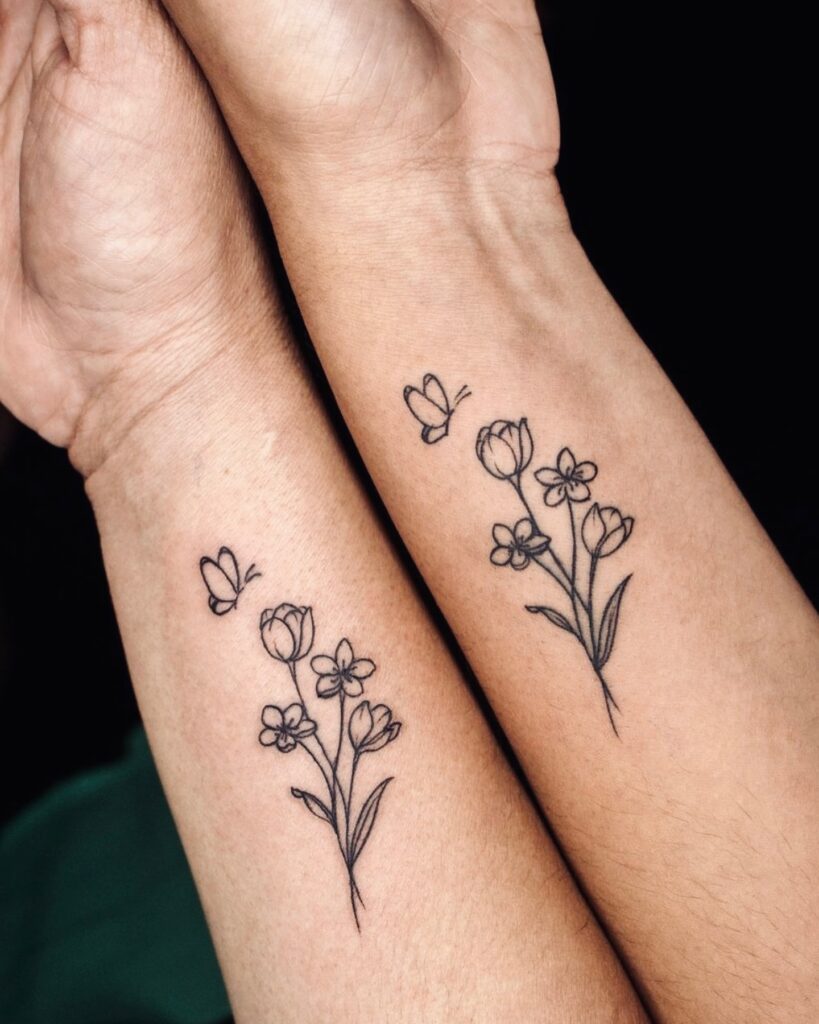 These elegant matching tattoos feature delicate flowers with butterflies fluttering nearby, symbolizing growth, transformation, and freedom. The flowers represent beauty and resilience, while the butterflies add a touch of lightness and symbolize change and new beginnings.
