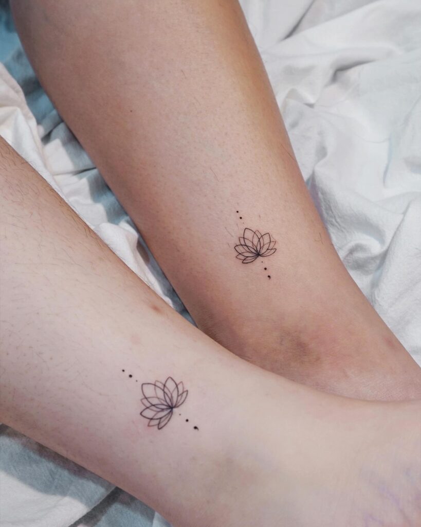 These subtle and delicate matching tattoos feature pink lotus flowers, symbolizing love, beauty, and spiritual growth. The soft pink tones add a gentle and romantic touch, representing purity and a shared journey toward enlightenment.