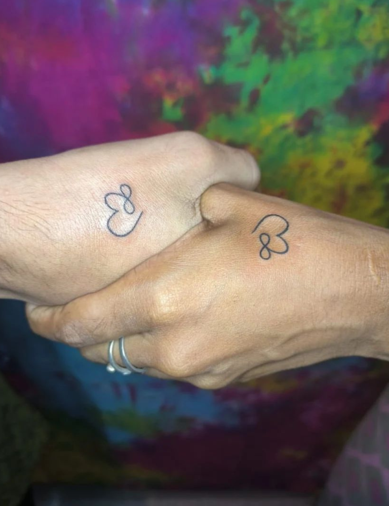 This couple’s tattoos consists of a heart shape that incorporates an infinity symbol within its design. The heart represents love, while the infinity symbol signifies endlessness and eternity. Together, they symbolize a commitment to an everlasting and infinite love.