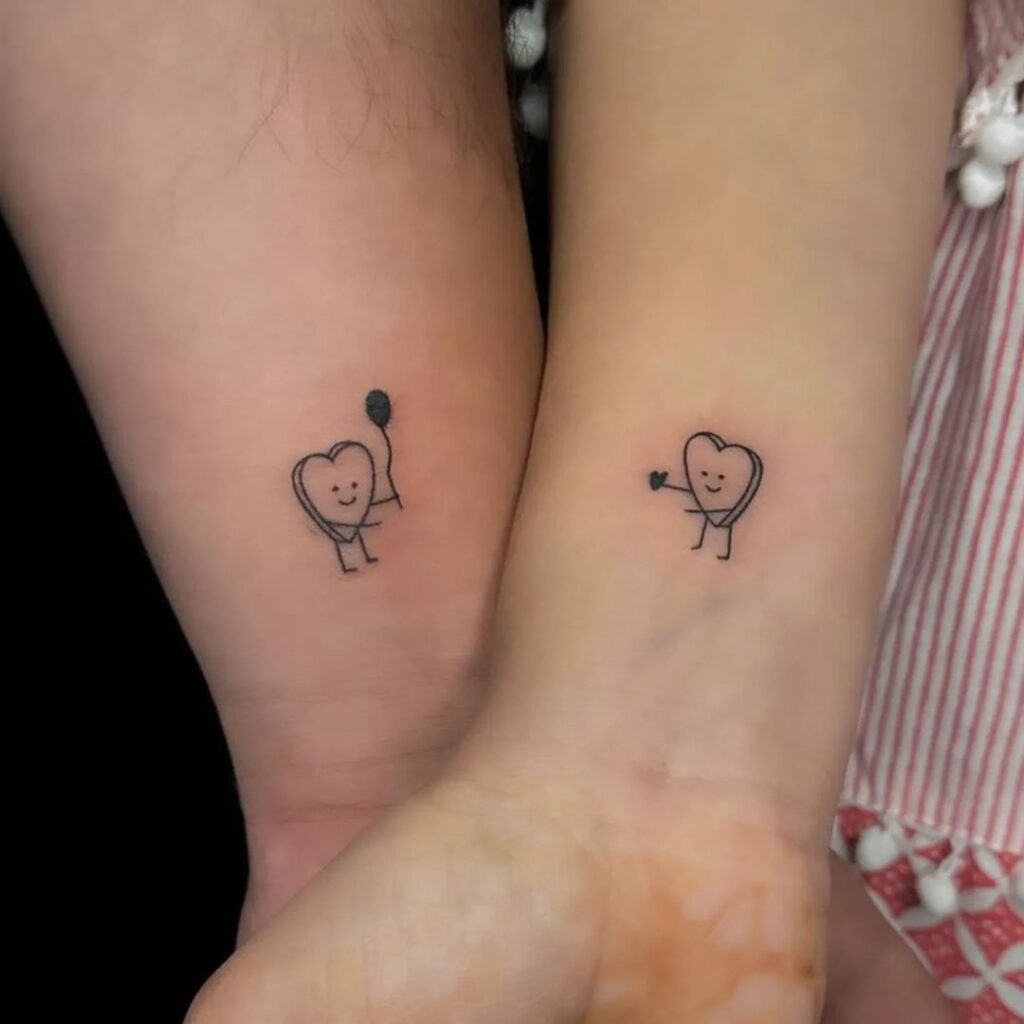 These tattoos represent the joy and lightheartedness in their relationship, highlighting the fun and loving bond they share. The matching heart characters reflect their connection and mutual affection, serving as a constant reminder of the happiness and love they bring to each other’s lives.