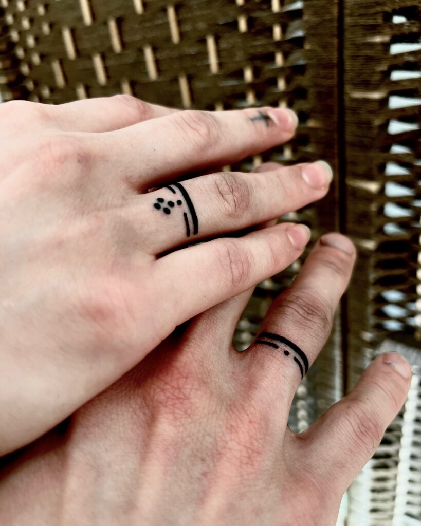 These minimalist ring tattoos feature simple yet meaningful patterns of dots and lines around the fingers, creating a unique, symbolic bond between the couple. The dots can represent unity, connection, or shared values, while the lines provide structure and continuity, resembling the form of traditional wedding bands.