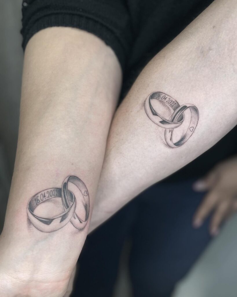 These matching tattoos feature two interlocked wedding rings, with a date engraved inside, symbolizing the couple’s commitment and shared journey. The rings represent eternal love and unity, while the date marks a significant moment, likely their wedding or engagement.