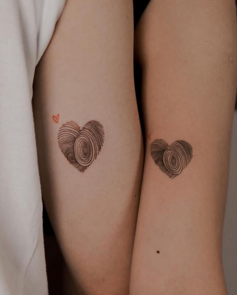 These unique matching tattoos feature hearts made from individual fingerprints, symbolizing the deep, personal connection between the couple. The fingerprint design represents individuality, while the heart shape signifies love, combining to create a powerful symbol of a bond that’s both personal and unique.