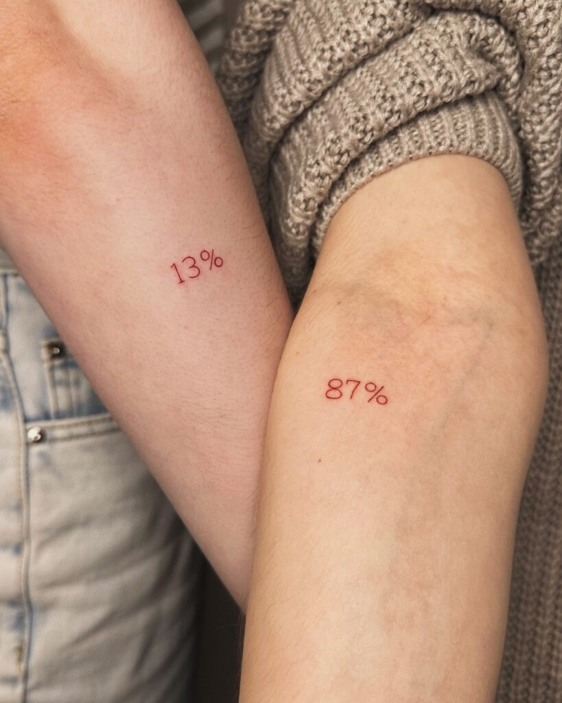 These minimalist tattoos feature “13%” and “87%” in red ink, representing a playful take on how two people complement each other. The percentages may signify a balance in the relationship, with each person bringing their unique share to make a perfect whole.