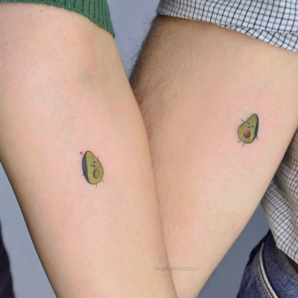 This couple’s tattoo features two cute and complimentary avocado designs on their forearms. Each tattoo depicts one half of an avocado, with one half including the pit and the other without it. The avocados have smiling faces, adding a playful and adorable touch to the design.