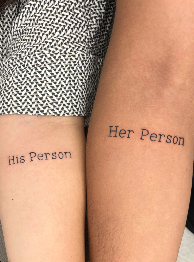 This is a simple yet profound design with the phrases “His Person” and “Her Person” inked on their forearms. These phrases highlight the deep connection and sense of belonging each person feels towards the other. The minimalist text design emphasizes the meaningful bond they share, indicating that they are each other’s chosen and most important person in life.
