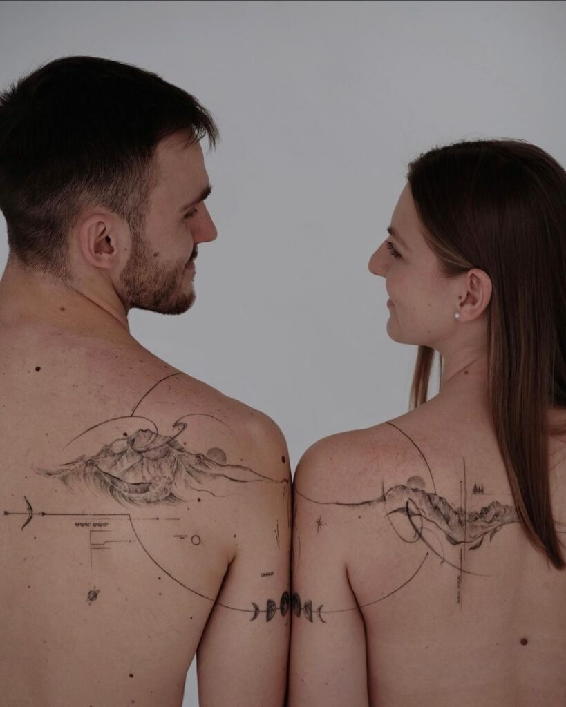 This beautifully detailed and interconnected design spans across both backs. When they stand together, the tattoos form a cohesive image of a mountainous landscape that flows seamlessly from one person’s shoulder to the other’s. The artwork includes intricate elements such as the moon phases, celestial symbols, and delicate lines that enhance the overall composition.