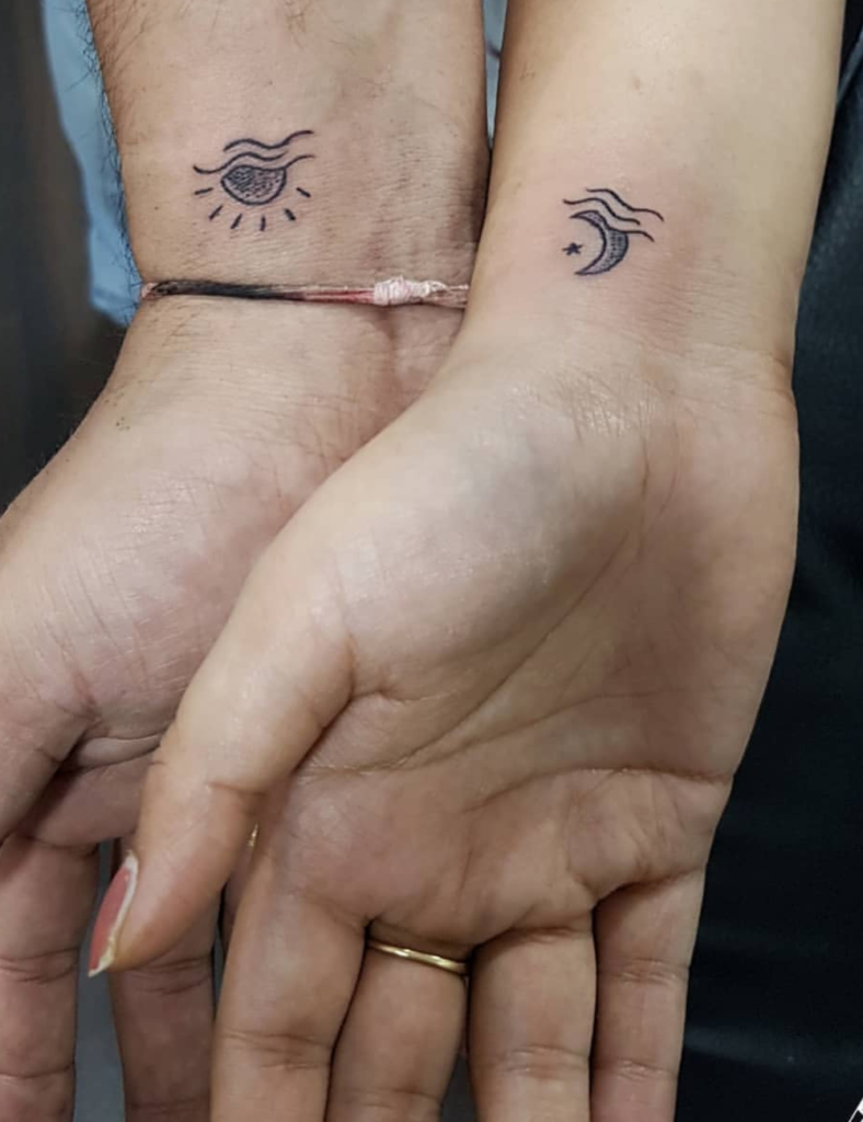This couple’s tattoo features complimentary sun and moon designs on their wrists. One wrist displays a stylized sun with rays, symbolizing warmth, life, and energy, while the other wrist features a crescent moon with a small star, representing calmness, night, and mystery.
