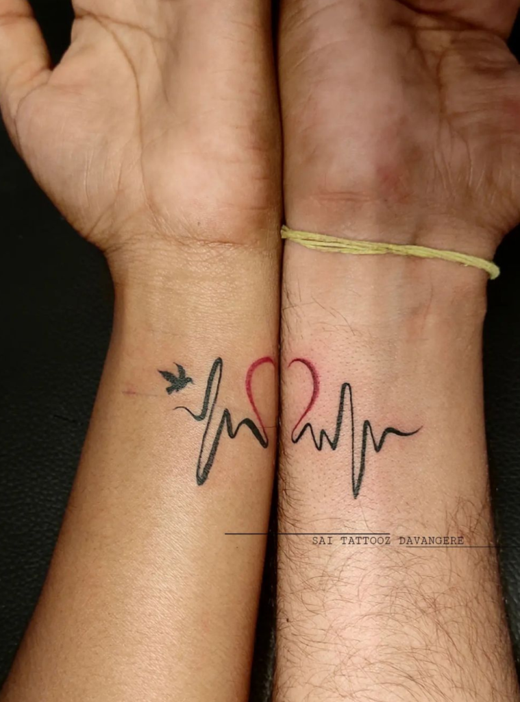 At the center, the heartbeat lines converge to create two halves of a heart, representing their unity and how they complete each other. Additionally, a small bird is depicted flying from the heartbeat on one forearm, symbolizing freedom, hope, and love’s liberating power. This tattoo beautifully signifies their shared life journey and the deep connection that binds their hearts together.