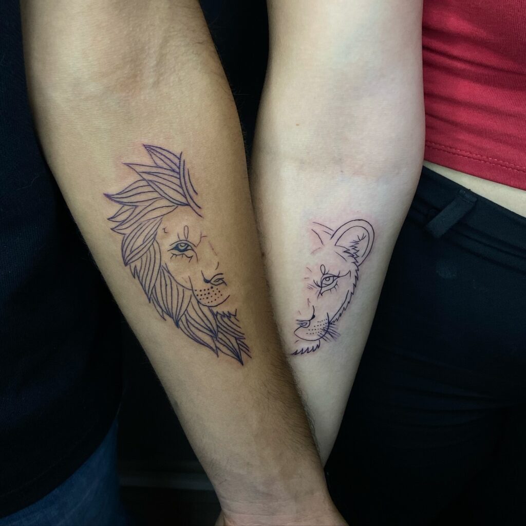 This couple’s tattoo set features a lion on one arm and a lioness on the other, symbolizing the strength and harmony between partners. The lion represents courage and guardianship, while the lioness embodies grace and resilience, creating a balanced and powerful union.