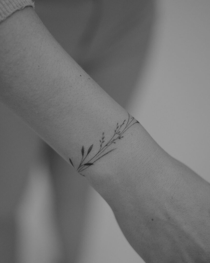 This wrist bracelet tattoo features a single, slender botanical stem that gently wraps around the wrist. Designed with ultra-fine linework, the branch includes tiny buds and leaves, creating a soft, natural flow that mimics the shape of the wrist.