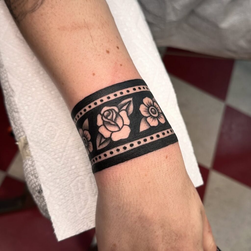This bold wrist bracelet tattoo features a stunning floral band framed by thick black lines and dotted accents. The central motif displays detailed rose and daisy-like flowers in a repeating pattern, adding a touch of elegance and nature-inspired beauty.
