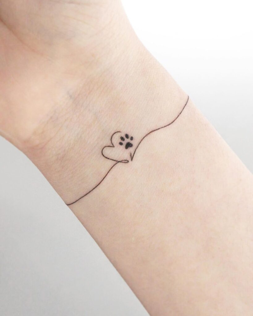 This minimalist wrist bracelet tattoo features a fine, continuous line that subtly wraps around the wrist. At the center lies a delicate heart with a tiny paw print inside, symbolizing the love and bond shared with a pet.