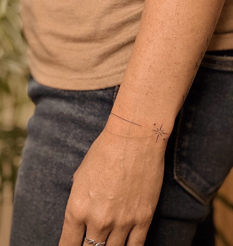 This tattoo features a clean, minimal bracelet line wrapping gently around the wrist, ending in a fine eight-pointed starburst. Tiny geometric elements enhance the star’s glow, giving the design a celestial and dreamy touch.