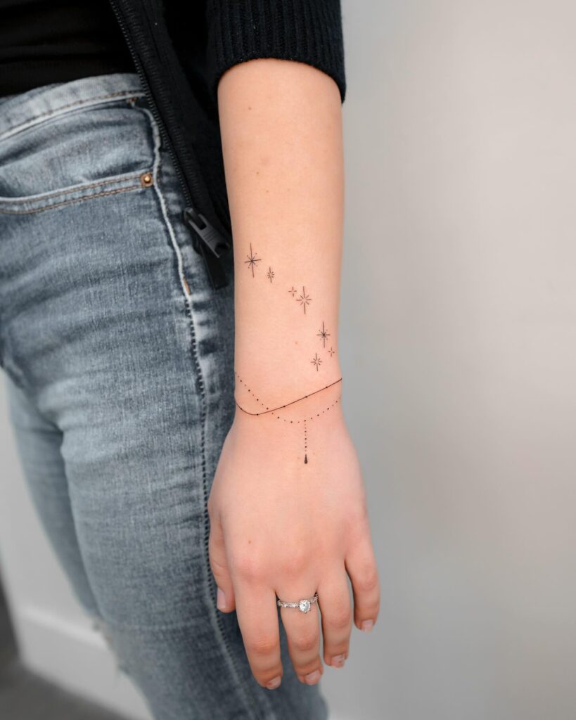 The bracelet itself is a mix of fine lines and dotted detailing, elegantly wrapping around the wrist like celestial jewelry. A tiny teardrop charm dangles below, adding a graceful finishing touch. The stars vary in size, creating a sense of depth and wonder. This tattoo is perfect for dreamers, stargazers, and anyone drawn to the beauty of the cosmos.