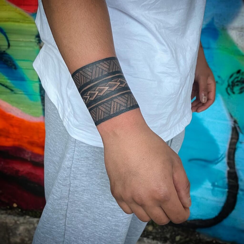 This bold wrist tattoo showcases traditional Polynesian patterns in a striking armband design. Intricate geometric motifs, including spearheads and linear patterns, are skillfully arranged to wrap the wrist in a symmetrical and meaningful band.