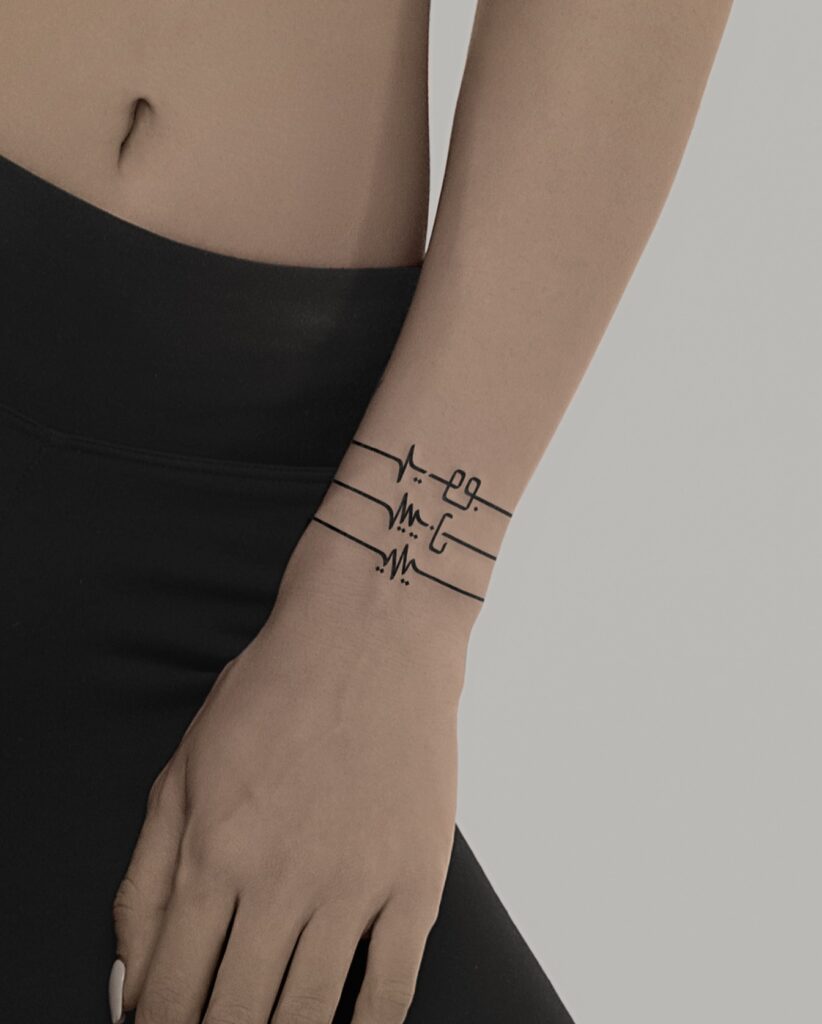 This wrist tattoo features three parallel bands, each incorporating elegant Kufic-style Arabic calligraphy. The bold, angular lines of the script create a structured, modern look while preserving the sacred geometry and cultural depth of traditional Arabic design.