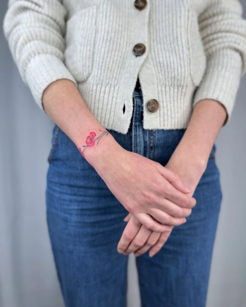 The contrast between the muted grey stem and the bright red petals creates a gentle yet eye-catching effect. Symbolizing remembrance, peace, and resilience, this tattoo offers both emotional meaning and visual beauty. It’s a perfect blend of color and elegance for someone who appreciates subtle, nature-inspired artistry.