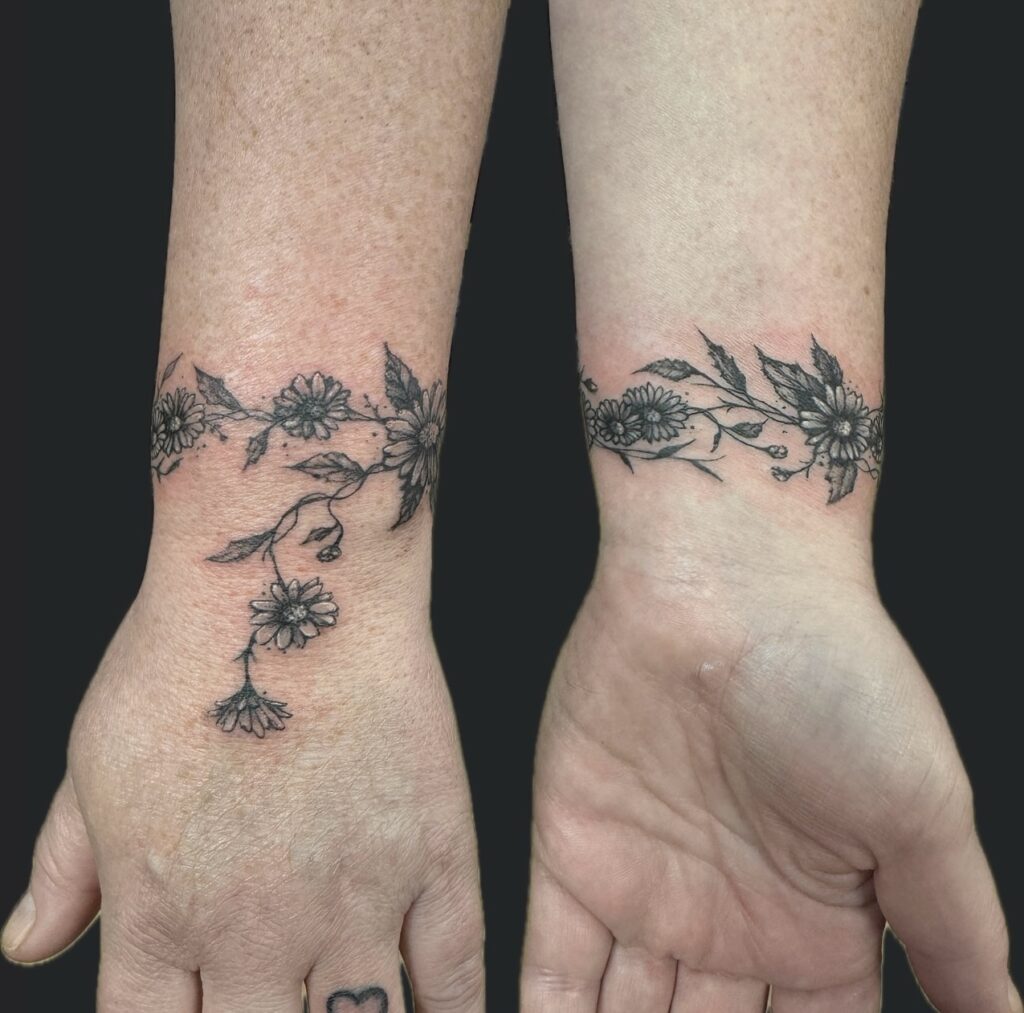 This lovely wrist bracelet tattoo wraps around like a chain of wildflowers in bloom. Featuring delicate daisies, small buds, and textured leaves, the design feels like a handwoven garland plucked straight from a meadow.