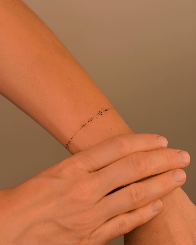 This ultra-fine wrist bracelet tattoo features a delicate ornamental pattern made of dots, tiny lines, and subtle geometric elements. The design wraps softly around the wrist, forming a barely-there bracelet that feels effortlessly elegant.