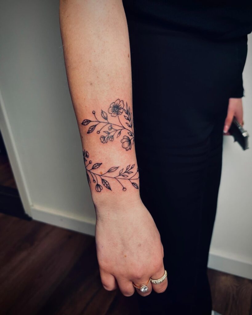 This tattoo features a delicate floral vine wrapped gracefully around the wrist like a natural bracelet. The fine linework captures blooming flowers, small buds, and leaves, creating an elegant and feminine look.