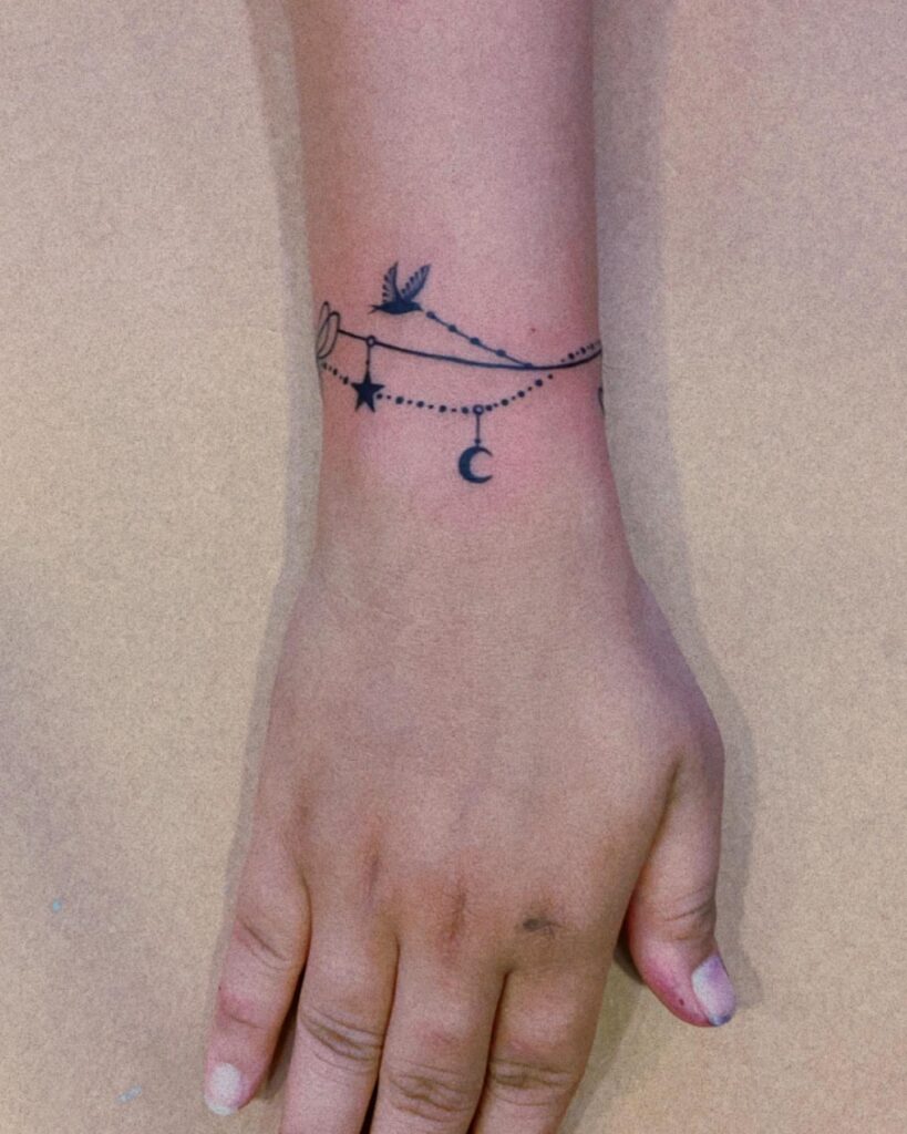 This whimsical wrist tattoo features a fine chain adorned with a crescent moon, star, and dotted bead-like details. A delicate bird and a flower-like shape enhance the magical feel, giving it the look of a charm bracelet drawn in ink.