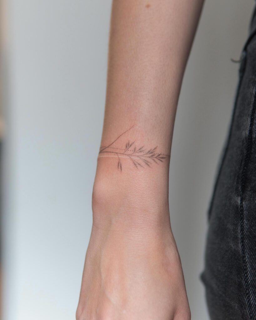 This tattoo features a graceful, fine-line botanical design that wraps softly around the wrist. Delicate fronds and sprigs extend from a central stem, with tiny dotted accents enhancing the flow and structure.