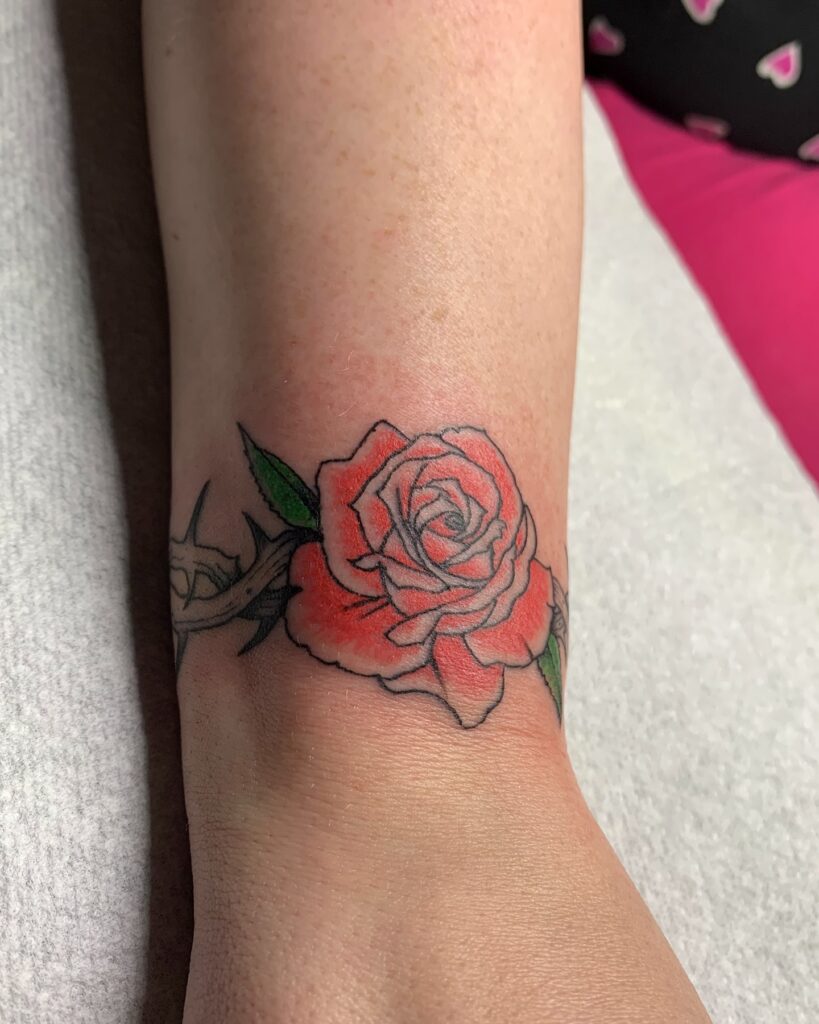 The contrast between beauty and danger makes this tattoo symbolic of love’s dual nature—both passionate and painful. It’s perfect for someone who embraces intensity and depth in their experiences. The placement gives it the look of a fierce, floral cuff around the wrist.