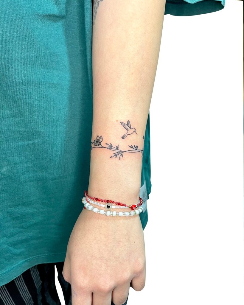 This delicate wrist tattoo features a fine floral vine wrapping softly around the wrist, with a graceful hummingbird hovering just above. The linework is subtle and airy, with tiny blossoms and leaves adding organic detail to the design.