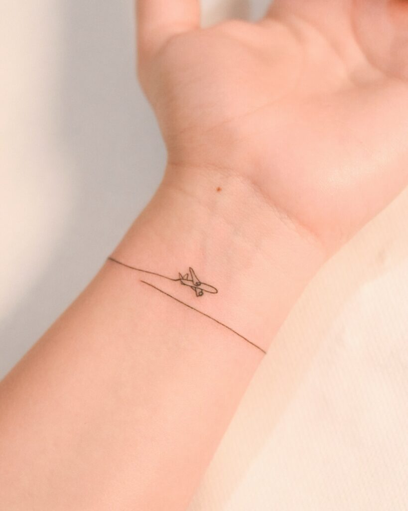 This delicate wrist tattoo features a single fine line encircling the wrist, with a tiny, minimalist airplane integrated into the design. The simplicity of the line creates a clean, modern bracelet effect, while the small airplane adds a personal touch of wanderlust or travel inspiration.