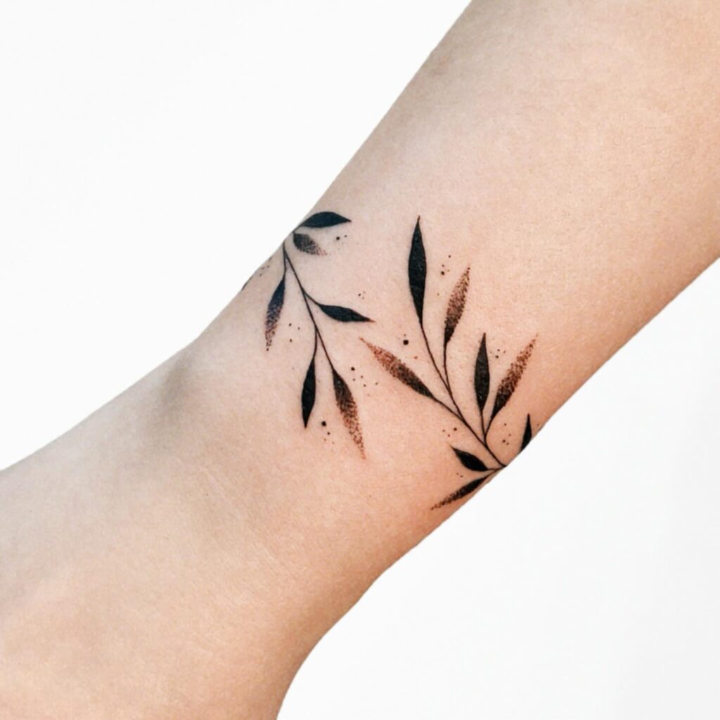 The minimalist style and subtle shading create a refined, natural look—like a soft vine or leaf band resting on the skin. Ideal for nature lovers and fans of organic, understated beauty, this tattoo feels both artistic and serene, capturing the essence of calm growth and quiet elegance.