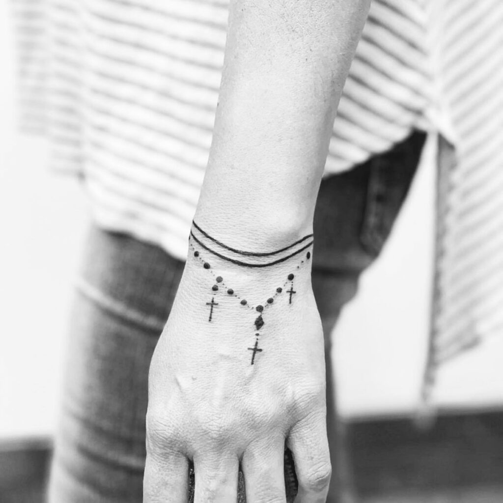 This delicate wrist tattoo mimics the appearance of a rosary bracelet, with a fine chain of tiny dots wrapping around the wrist and leading down to a small, simple cross. The design conveys faith, protection, and spiritual grounding in a subtle, elegant way.