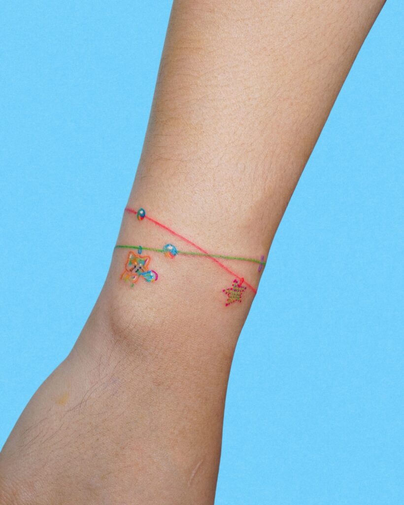 This tattoo mimics a playful, handwoven friendship bracelet, complete with colorful threads, beads, and charming symbols like a butterfly and star. The red and green strings cross delicately around the wrist, while tiny gems and stitched shapes add a cheerful, nostalgic vibe.