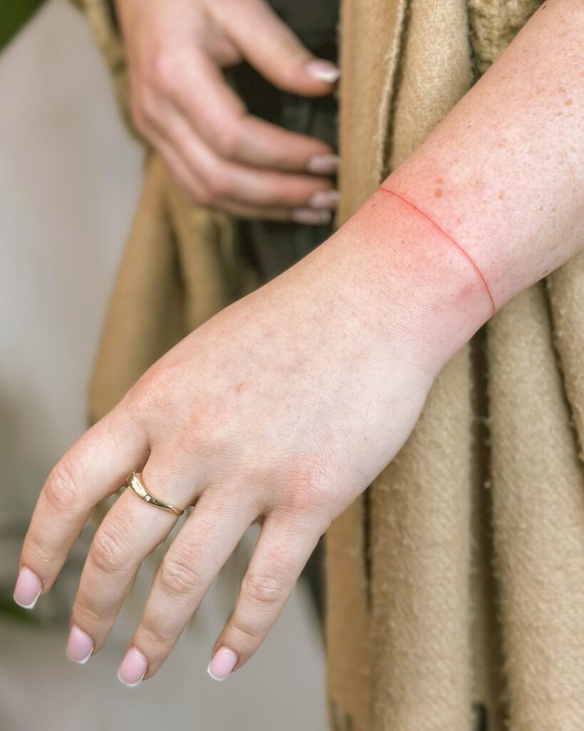 This simple yet meaningful wrist tattoo features a single, thin red line wrapping around the wrist like a delicate string. Inspired by the red string of fate or protection thread from various cultures, this design symbolizes love, destiny, spiritual connection, or safeguarding from negative energy.