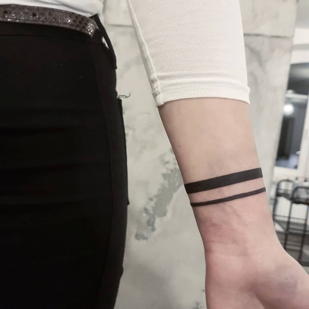 This bold tattoo features two solid black bands wrapping cleanly around the wrist, creating a minimalist yet powerful bracelet effect. The top band is slightly wider than the bottom, giving the design subtle variation while maintaining symmetry and balance.