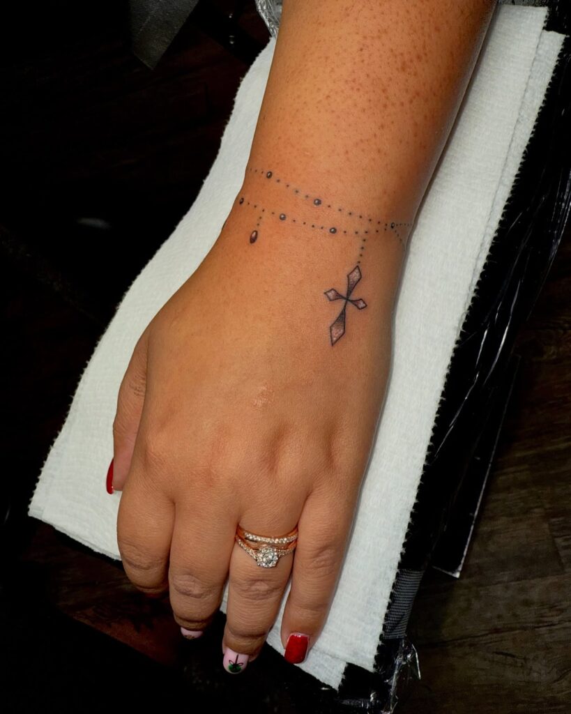 Its minimal yet meaningful design makes it perfect for those wanting to express faith through subtle and elegant body art. The placement across the wrist and hand enhances the bracelet effect beautifully.