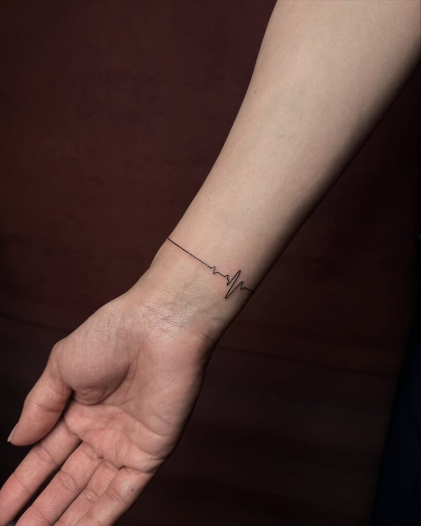 This minimalist tattoo wraps the wrist with a fine, continuous line that transforms into a heartbeat waveform. The clean, precise strokes create a sleek bracelet effect, symbolizing life, love, or personal resilience.