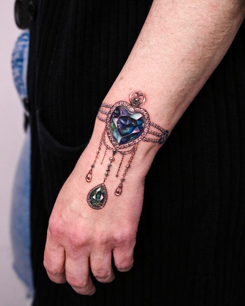 This tattoo beautifully mimics an ornate jeweled bracelet, featuring a large, heart-shaped gem as the centerpiece. The heart glows with rich blue and green hues, encased in a pink-toned metallic frame.