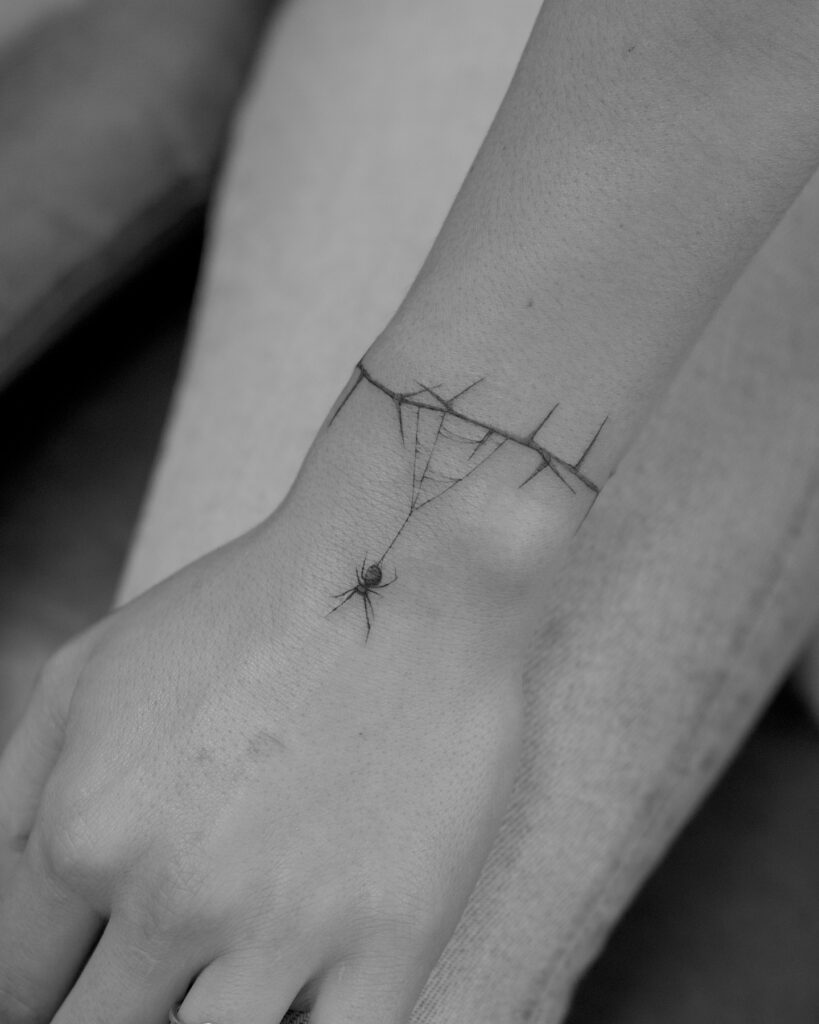 This wrist tattoo features a striking band of thorns encircling the wrist, from which a realistic spider descends by a single thread. The thorny bracelet adds a sharp, edgy feel, while the spider brings a touch of mystery and symbolism.