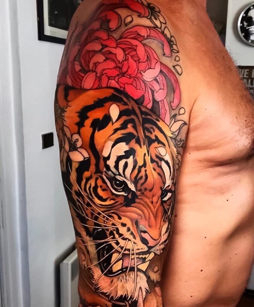 Above the tiger, a large red chrysanthemum blooms, representing resilience, longevity, and the warrior’s spirit. The flowing petals balance the ferocity of the tiger with elegance, creating harmony within the design.