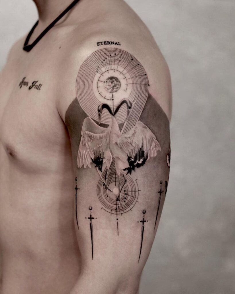 The birds’ wings spread wide, giving the piece strong movement and balance across the arm’s surface. Below, fine line swords stand upright, symbolizing protection and strength within the design.