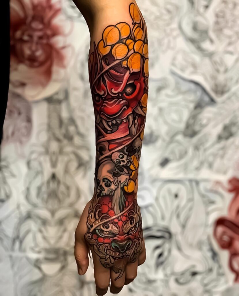 This half sleeve tattoo features a striking Japanese Oni mask, a powerful symbol of strength, protection, and inner struggle.