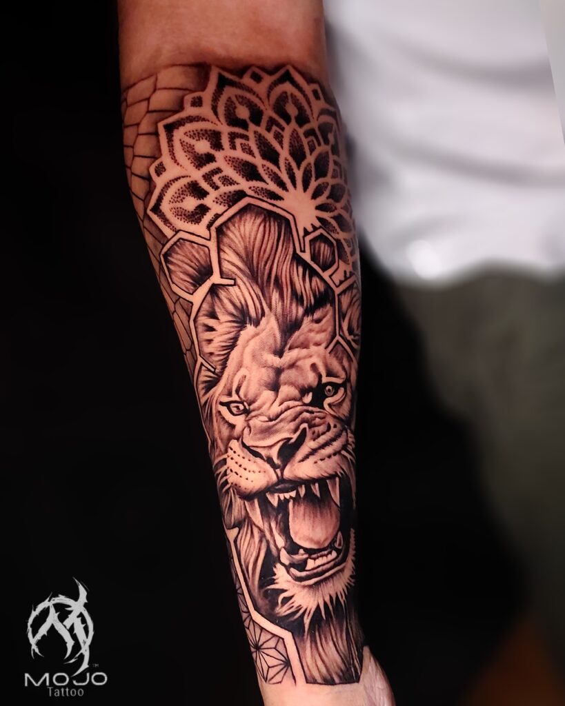 This half sleeve tattoo features a roaring lion combined with detailed geometric and mandala-inspired elements.